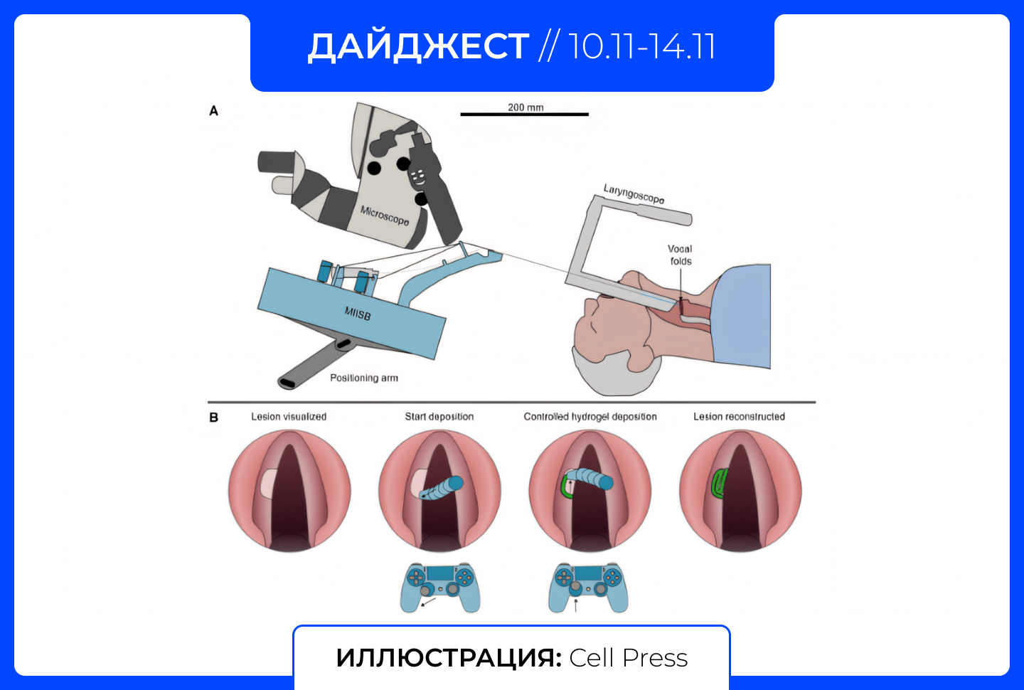 Исследователи из Университета Макгилла (Канада) разработали самый миниатюрный 3D биопринтер в мире, предназначенный для восстановления голосовых связок прямо во время операции. Устройство шириной всего 2,7 мм — примерно с рисовое зёрнышко — оснащено гибким «хоботообразным» соплом, способным точечно наносить гидрогель на повреждённые ткани без потери обзора для хирурга.