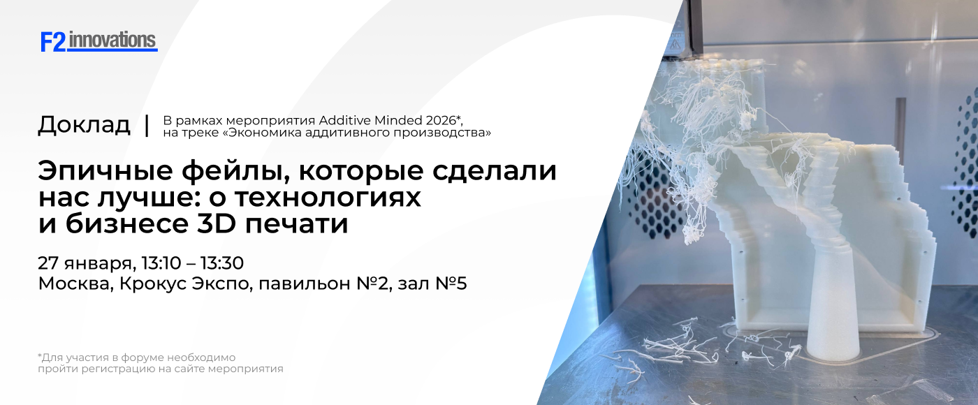 F2 innovations традиционно принимает участие в деловой программе мероприятия. Генеральный директор F2 innovations Евгений Матвеев выступит в треке «Экономика аддитивного производства» с докладом «Эпичные фейлы, которые сделали нас лучше. О технологиях и бизнесе 3D печати».